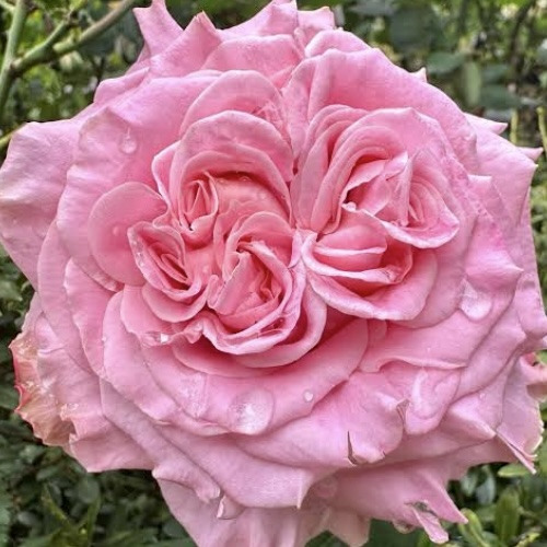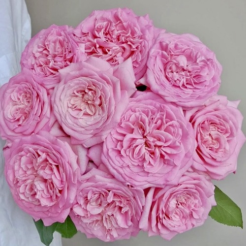 Квіти троянди Ешлі великі, густомахрові, діаметром 9–12 см, містять до 60 пелюсток, що надає їм об’ємності та м’якості. Відтінок пелюсток — перламутрово-рожевий, ніжний, з ледь помітним сяйвом, яке змінюється залежно від освітлення. Форма бутона переходить від класичної до чашоподібної, завдяки чому кожен етап цвітіння має свою унікальну привабливість.