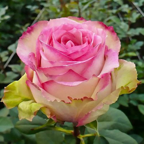 Роза Есперанса - лауреат у номінації "найпишніший келих". Щільний, великий бутон із поєднанням рожевого та кремового кольорів. Крайні пелюстки мають зелений відтінок. Бутон дуже великий до 12 см, є пишною квіткою з великими пелюстками. Троянда стійка до захворювань, середня морозостійкість. Кущ виростає досить вузький. Завширшки 60 см і 120 см заввишки. На стеблі майже немає шпильок. Листя світло-зелене. Аромат слабо виражений. Форма бутону класична. Забарвлення пелюсток можливе від світло-рожевого до рожевого. По краю бутон обрамлений салатовими пелюстками. На одному бутоні загалом 50 пелюсток. Сорт повторноквітучий.