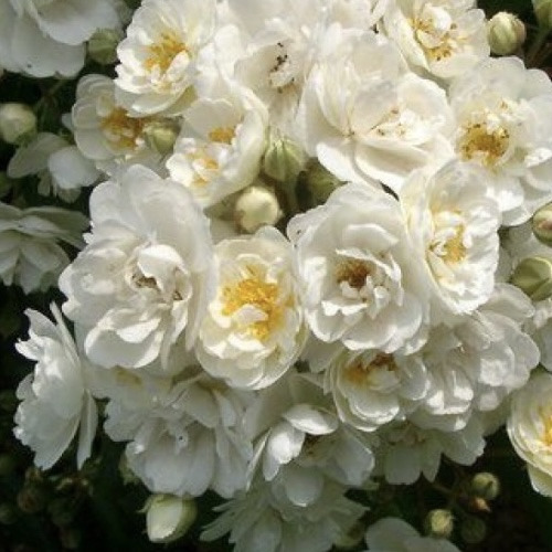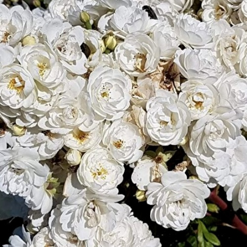 - Квітки: Троянда Ватерлоо цвіте маленькими махровими квітками діаметром 3 см. Вони зібрані в густі кулясті суцвіття, що вкривають третину довжини пагонів. Колір пелюсток — чисто-білий, що прекрасно контрастує з темно-зеленим листям та червонуватими черешками. Аромат квіток легкий і ненав'язливий, що додає їм елегантності.