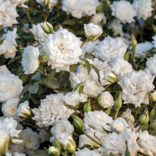 Густомахрові білі бутони 5–6 см, до 18 на пагоні.