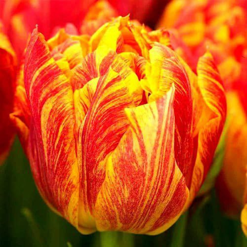 Квітки тюльпана Флеймінг Бейбі приваблюють красивим поєднанням червоного, жовтого і помаранчевого кольорів. Квіти виглядають майже як півонії, а міцні стебла рослин добре тримають квіти і можуть витримувати сильні весняні зливи. Листя сірувато-зелене з гострими кінчиками. Інші особливості: