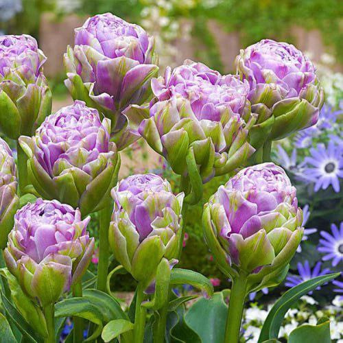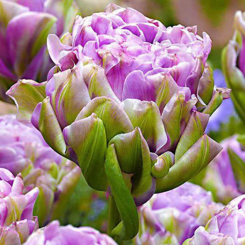 Махровий тюльпан Violet Pranaa характеризується великими махровими квітами, які проходять просто фантастичну трансформацію. Бутони мають повністю зелений колір. Розпускаючись, пелюстки набувають рожевого забарвлення, і за формою квітка набуває схожість із зеленою чашею, переповненій дивовижно ніжними рожевими мереживами.