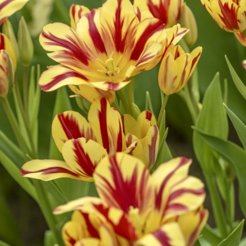 Квітки пофарбовані в яскраво-червоні і сонячно-жовті тони, що на тлі насичено-зеленого листя виглядає особливо мальовничо. Листя подовжено-ланцетні, ростуть від основи і до середини стебла. Аромат ніжний, ледь вловимий, не нав'язливий.