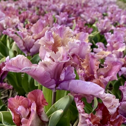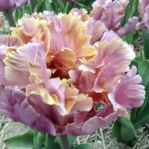 Цей сорт відноситься до махрових, його бутони діаметром 5–10 см розкриваються у квітні–травні, даруючи саду справжню весняну розкіш. Кремово-рожеві пелюстки з делікатними жовтими кінчиками створюють м’який контраст, який виглядає особливо гармонійно при висадці групами. Тюльпан Vovos виростає до 45 см у висоту, завдяки чому підходить як для квітників, так і для зрізання. Його міцні стебла добре тримають квітку, а ніжний аромат додає витонченості.