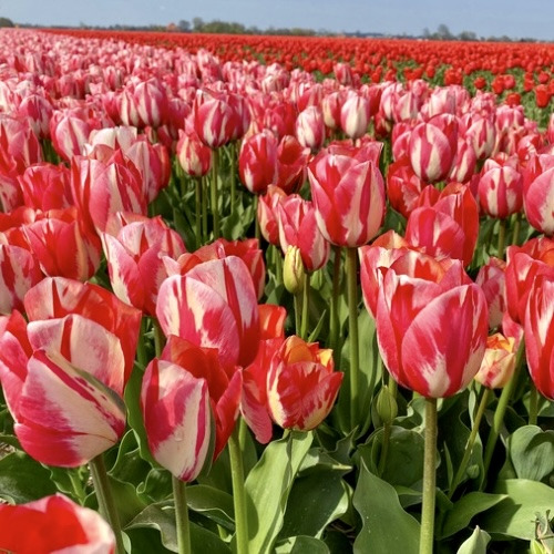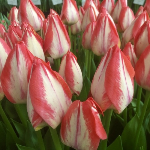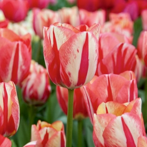 Тюльпан Spryng Break – яскравий сорт із класу Тріумф, який вражає незвичною грою відтінків та тривалим цвітінням. Великі келихоподібні бутони на початку розпуску мають білосніжний фон із насиченою рожево-червоною смугою по центру пелюстка. З часом забарвлення стає більш інтенсивним, а квіти розкриваються ширше, набуваючи форми елегантної чаші. Така зміна кольору робить сорт особливо декоративним у садових композиціях.