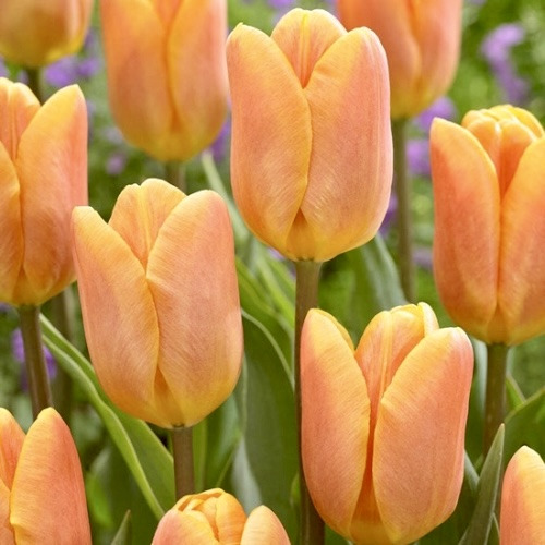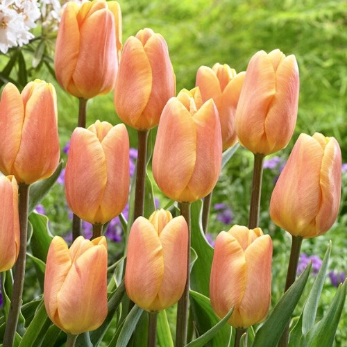 Тюльпан Belleville — це сорт класу Тріумф, що поєднує в собі насичені кольори, витончену форму квітки та витривалість до погодних умов. Він легко впишеться у будь-яку весняну композицію та стане яскравим акцентом у клумбі чи букеті. Belleville приваблює погляд гармонійним поєднанням теплого персикового й оранжевого тону з легкими мандариновими або червонуватими штрихами по краях пелюсток — залежно від освітлення. Така гра кольору робить кожен бутон унікальним і живим.