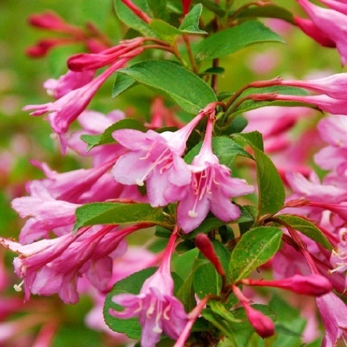 Вейгела Пінк Принцес (Weigela florida Pink Princess) - розлогий чагарник висотою до 1,5 м і такою ж шириною. Річний приріст 20см. Цвіте рясно в травні-червні світло-рожевими дзвоновими квітками, зібраними в суцвіття по 3-5 шт. Повторне цвітіння в серпні-вересні. Листя зелені, овальні, загострені. Любить сонячні місця, родючі дреновані грунти.