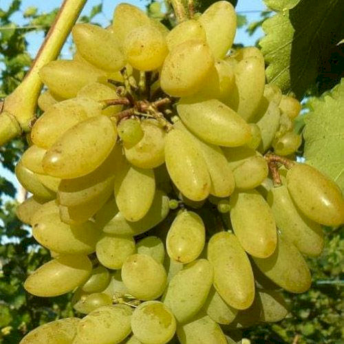 Виноград Тимур - сорт раннього терміну дозрівання (105-110 днів), ця чудова селекція виведена у ВНДІВів ім. Я І. Потапенка, отримана в результаті схрещування (Фрумоаса Албе х Захоплення). Саджанці пропонуємо кореневласні. Кущ сильно-рослий, лоза визріває добре. Кетяги середнього розміру 400-600 гр., Циліндро-конічної форми, середньої щільності. Ягоди великі, масою 6-10 грам (29 х 21 мм), овальної форми, довгі, із загостреним кінчиком, білі з бурштиновим або легким коричневим засмагою на сонці. М'якуш приємний, хрумкий, щільний, з легким мускатом, високих смакових якостей. Шкірка тонка, при їжі не відчувається. Навантаження на кущ 30-40 очок. Загальна оцінка стійкості до хвороб – вище за середню 2,5 бала. Висока морозостійкість до -25°С.