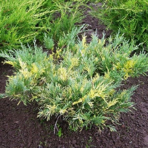 Ялівець середній Блю енд Голд декоративний цілий рік, оригінальний і привабливий чагарниковий сорт ялівцю з розлогою неправильною формою крони, синьо-зеленим забарвленням хвої та золотисто-жовтими великими вкрапленнями.