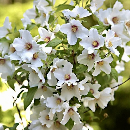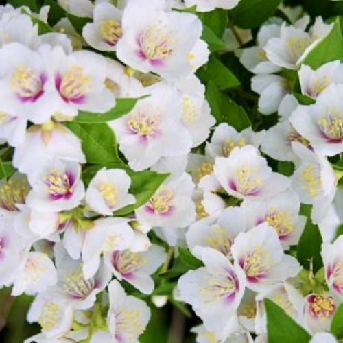 Жасмин гібридний Бель Етуаль (Philadelphus × Belle Etoile) — витончений декоративний кущ середнього розміру, що поєднує в собі розкішний вигляд і приголомшливий аромат. Виведений у Франції шляхом схрещування жасмину звичайного та дрібнолистого, цей сорт одразу привертає увагу завдяки компактній формі крони, білосніжним квіткам з яскраво-малиновим центром і неймовірно приємному суничному запаху.