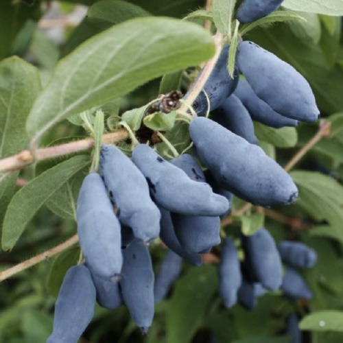 Жимолость суміш сортів. Плоди темно-блакитні з сизим восковим нальотом, довжиною 12-35 мм, різноманітної форми: циліндричні, довгасто-еліптичні, інколи округлі. Плоди дозрівають у кінці травня-червня. М'якоть соковита, червоно-фіолетова. Віддає перевагу родючим, розпушеним, добре дренованим грунтам.